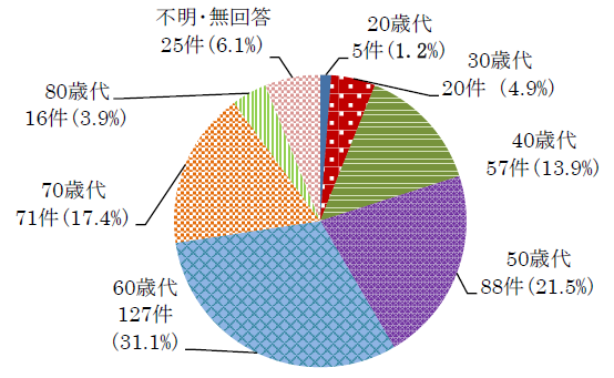 年代をみると、50歳代(88件21.5%)と60歳代(127件31.1%)を合わせると相談の5割を超えていました。