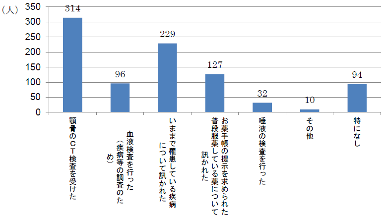 手術前にCT検査を受けたのは314人(62.8%)、今まで罹患した疾病について訊かれたのは229人(45.8%)、服薬について訊かれたのは127人(25.4%)でした。